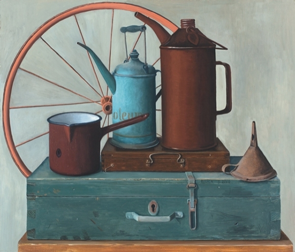 Stillleben mit Rad und Blechkannen, 2000 Öl auf Tischlerplatte, 65 x 75 cm